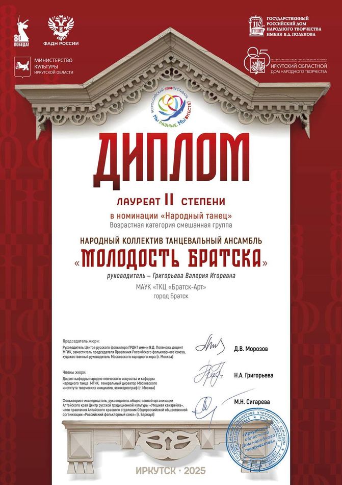 - Диплом Гран-при VI Межрегионального хореографического конкурса-фестиваля «Байкальское Siяние» в номинации «Народный танец», возрастная группа 17-25 лет, г. Братск
