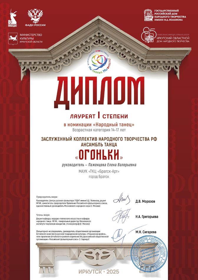 Коллектив «Огоньки» давно стал визитной карточкой города, мастерски соединяя корни народной хореографии с актуальной сценической выразительностью. Их почерк узнаётся сразу: безупречная техника, смелые постановочные находки и костюмы, в которых каждая деталь — произведение искусства.