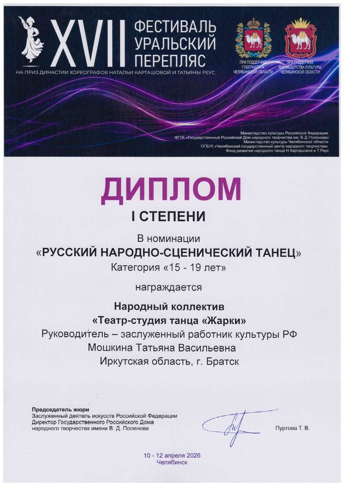 - диплом участника XIV Всероссийского фестиваля народного танца «Уральский перепляс» на приз династии хореографов Н. Карташовой и Т. Реус в номинации «Сценический народный танец», г. Челябинск